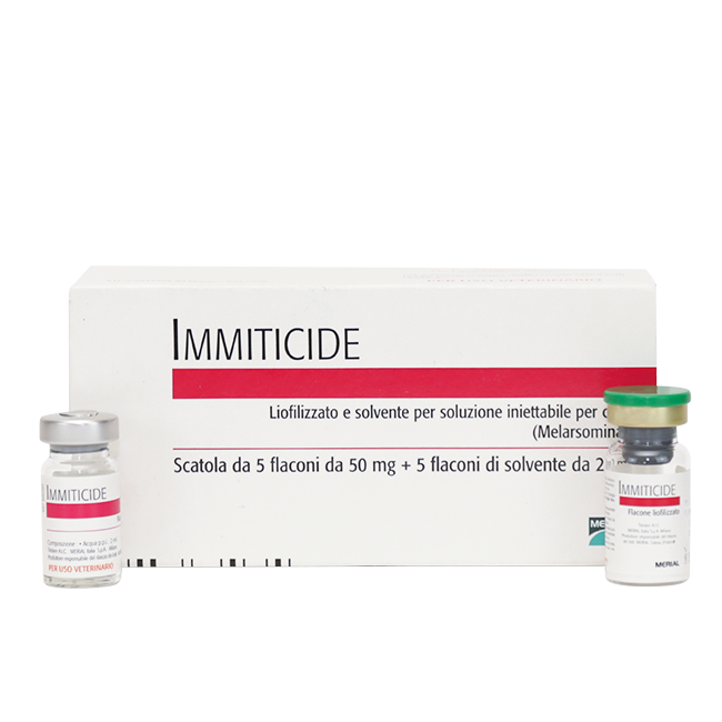 Иммитицид (Меларсомин) вводится внутримышечно, в поясничную мышцу. Препарат следует вводить только глубоко внутримышечно в эпаксиальной (поясничную) мышцы с третьей по пятую поясничной области. При повторных инъекциях старайтесь избегать уколов в одну и ту же область – как минимум, чередуйте правую и левую сторону тела животного. Препарат действует на взрослых паразитов, уничтожение которых – единственный способ справиться с болезнью. Стандартно препарат вводят дважды, с интервалом в сутки. При этом животному назначаются клеточное содержание и низконатриевая диета.